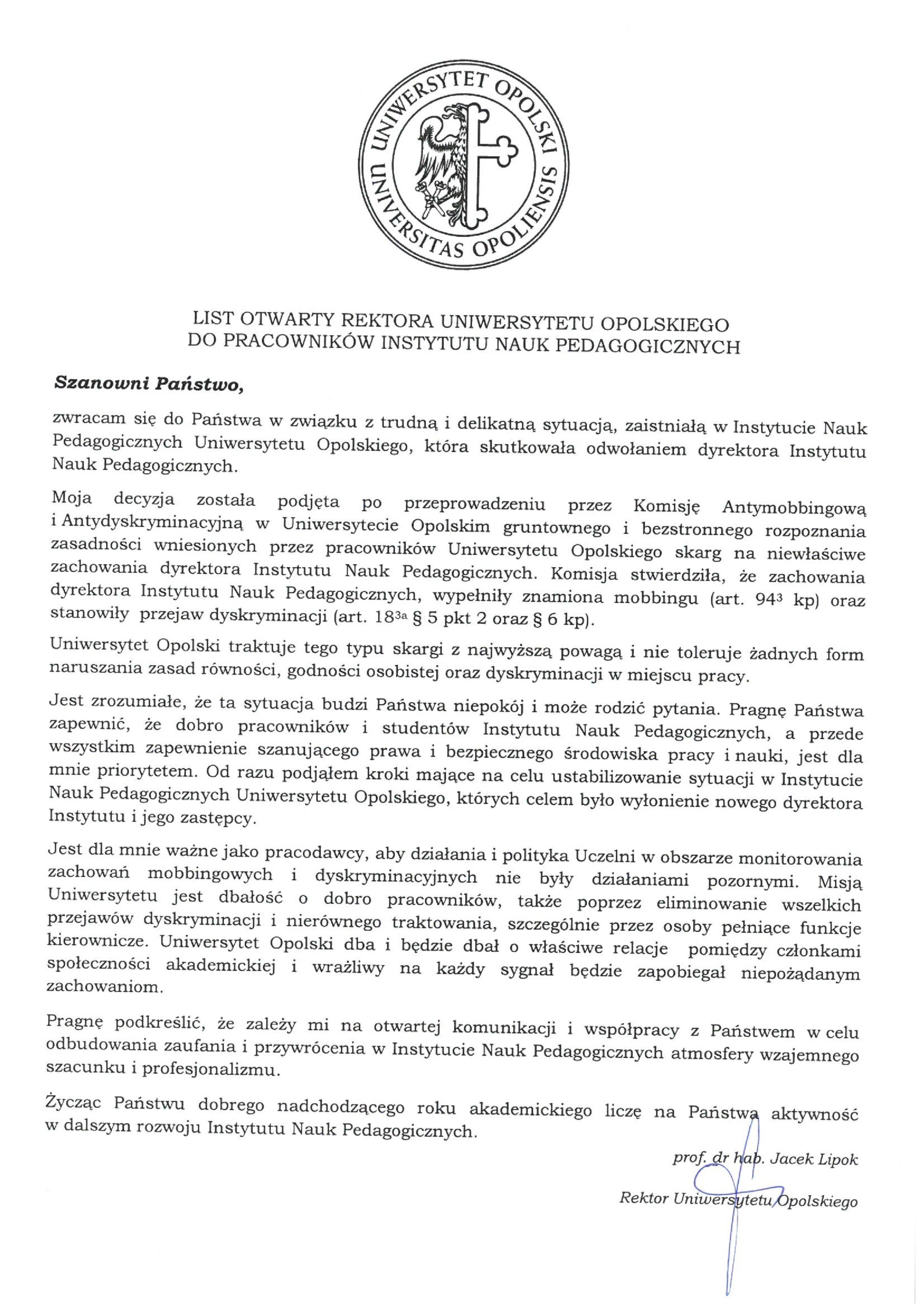 List otwarty Rektora Uniwersytetu Opolskiego do pracowników Instytutu Nauk Pedagogicznych
